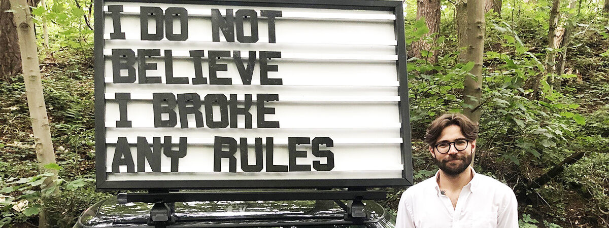 Islington to Barnard Castle via Durham – A Public Text Piece, saw Sam Edward, currently completing his MA in Arts and Education Practices at Birmingham City University, retrace the 260 mile route taken by the Prime Minister’s political adviser in April 2020. Edward’s specially adapted Mini car displayed quotes by Cummings including ‘I behaved reasonably’, ‘To test my eyesight’ and, ‘I do not believe I broke any rules’.