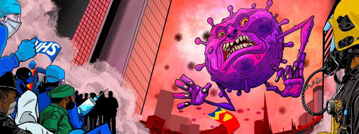 One of the nurses depicted displays the BCU logo (pictured above) as she enters the fray. The city’s iconic skyline can also be seen, featuring the Rotunda and St Martins-in-the-Bullring as well as the iconic Birmingham bull and the flag of Birmingham.