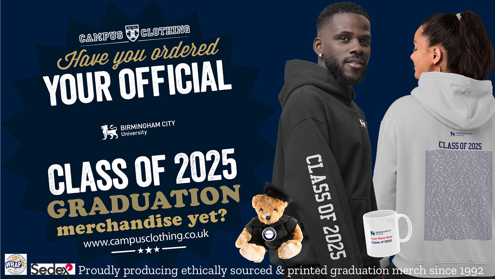 You’ve got the degree, now buy the t-shirt! We’ve teamed up with the brilliant Campus Clothing to provide an exclusive range of merchandise to our graduates. Merchandise will be available on the day at our graduation ceremonies and can also be pre-ordered via our Official Online Graduation Shop. From luxury hoodies & t-shirts with graduate’s names printed on the back, to graduation bears, mugs, and pin badges. Choose something special to keep as a memento of your time at the Birmingham City University.