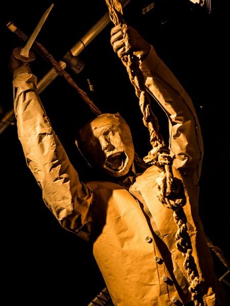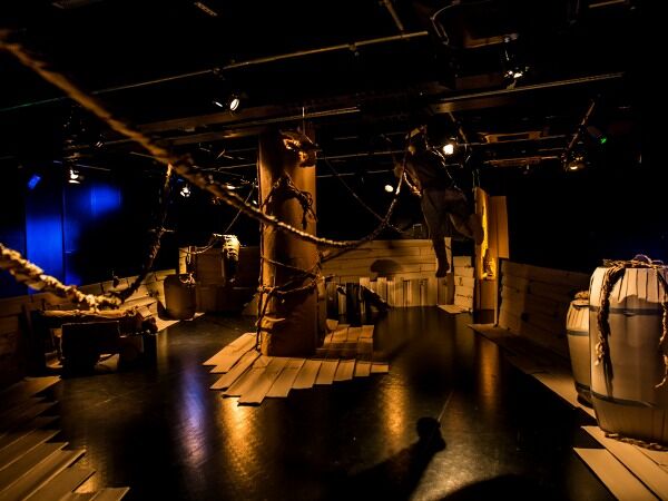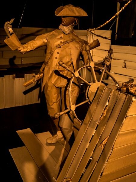 I am now part of his dream, a huge pirate ship made of paper and card, creaks as it sails across the ocean in front of me, whilst pirates climb the rigging and crabs and rats cling to the ship, all with the aid of live sound effects.