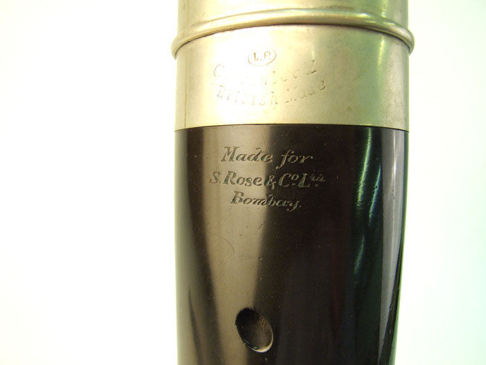 Inscription: Engraved on lower bell ferrule: “BOOSEY & Co / LONDON / 24778”; engraved on crook – receiver: “BOOSEY & Co / 24778”; engraved on boot ferrule: “BOOSEY & Co / MAKERS / LONDON / 24778 / L.P. (in oval) / Guaranteed / British Made”; and directly below on body of boot: “Made for / S. Rose & Co Ltd / Bombay”.