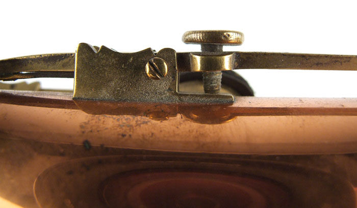 Seven domed keys (originally soft leather inners) mounted on brass saddles: low B natural, Csharp, D, E flat, E natural, F, F sharp.