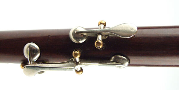 Five keys with modern-style salt spoon key flaps mounted by post and axles. Spring attached by rivets to underside of key; spring ends rest on round metal plugs recessed into the wood. Large and slightly oval embouchure hole.