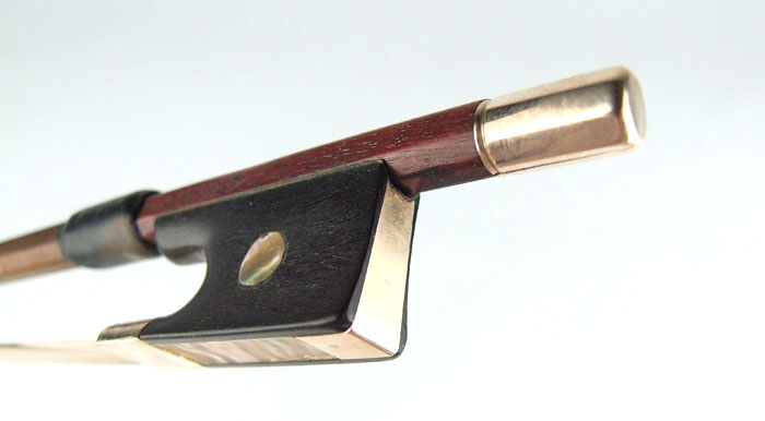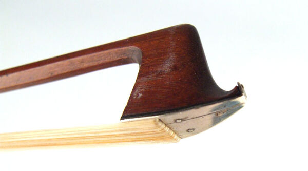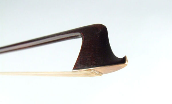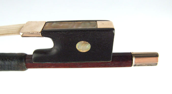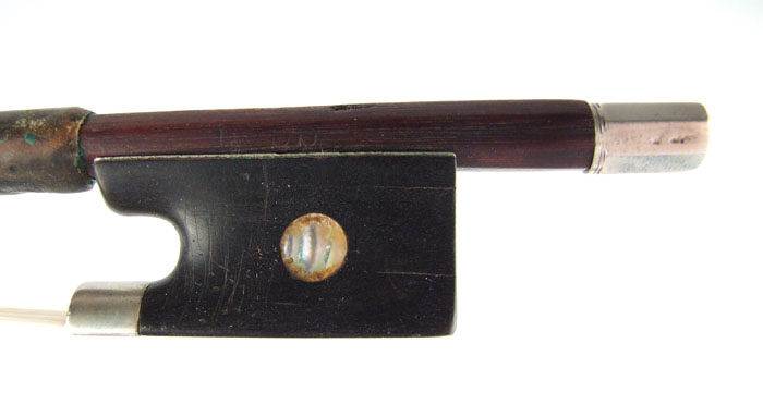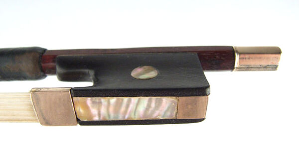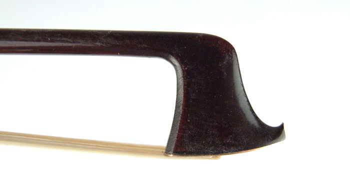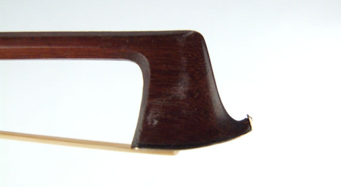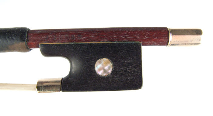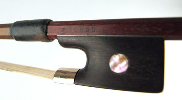 The date of the bow is definitely pre-1878 (in 1878, his branding changed to JAS. TUBBS). Typical chocolate-brown varnish. Modern-style head with gold face.