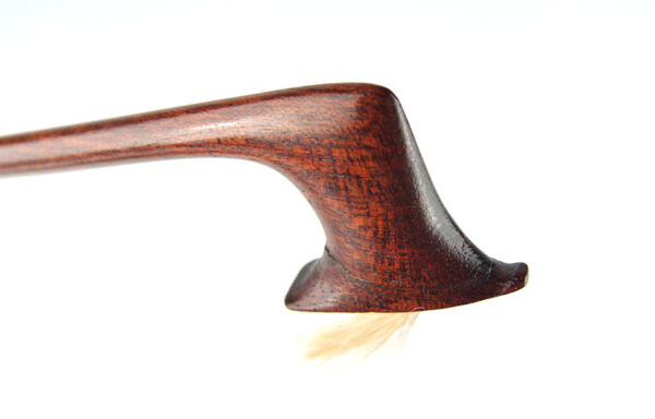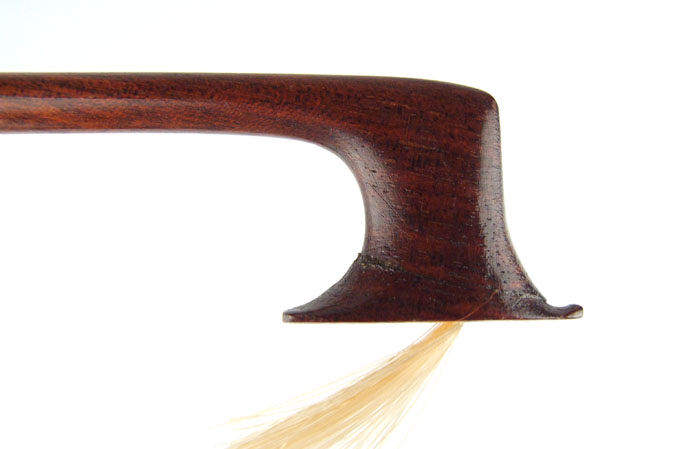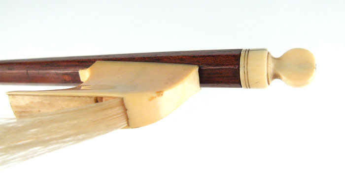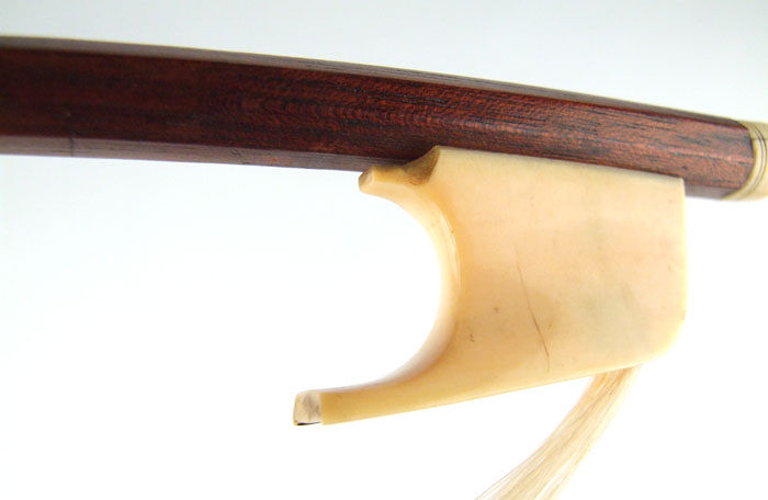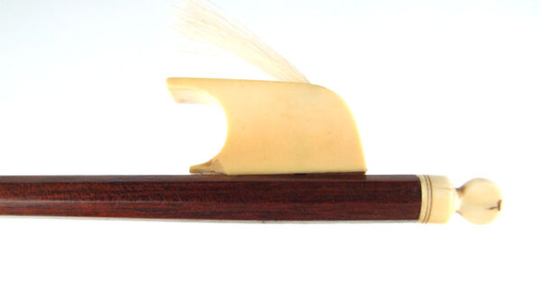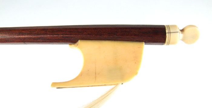 Technical description: Wood unknown. Canted shape, open ivory frog with butterfly ivory button. Cramer style head.
