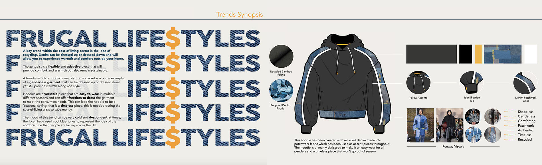 A first year module exploring factors affecting the fashion industry for future forecasting, Elizabeth identified post Covid impacts around more localised shopping, wellbeing and the athleisure casual market generated the need for more cocooning, soft, comforting clothes. A soft colour palette and puffer jackets will be key. Using Indesign to present her findings and learning about business theories like PESTLE she helped create a considered and future proof concept.