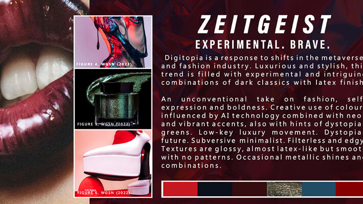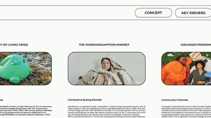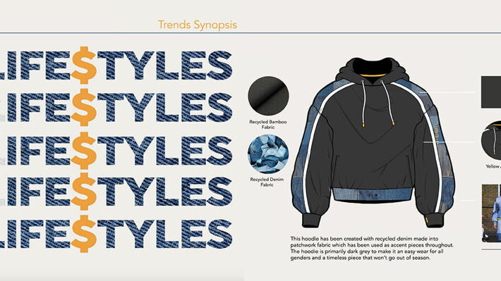 A first year module exploring factors affecting the fashion industry for future forecasting, Elizabeth identified post Covid impacts around more localised shopping, wellbeing and the athleisure casual market generated the need for more cocooning, soft, comforting clothes. A soft colour palette and puffer jackets will be key. Using Indesign to present her findings and learning about business theories like PESTLE she helped create a considered and future proof concept.