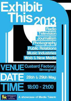 The ‘Exhibit This’ exhibition runs from 6pm until 9pm on Tuesday 28 May and Wednesday 29 May at The Custard Factory, Gibb Street, Birmingham, B9 4AA. For more information, follow @ExhibitThis2013 on Twitter.