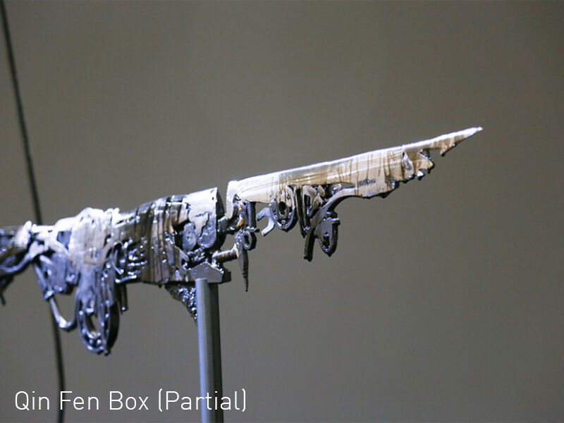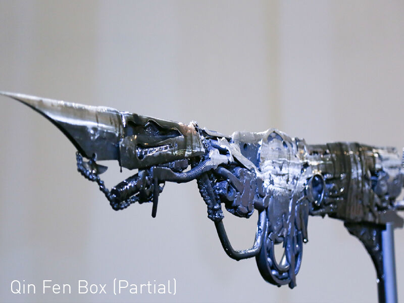 Shi Jinsong’s works have always possessed a certain strength, and even a hidden ferocity. In creating his work Qin Feng Box, Shi benefited from his understanding of traditional Chinese Kunqu opera. In his view, this ancient opera form, which originated in the middle period of the fourteenth century and is based on the Kunshan melody and its folk songs, is a kind of transformation: ‘A carefully studied and refined version of everyday life, thereby turned into a different aesthetic system.’ For this exhibition, Shi collected a variety of daily household items (pans, bowls, knives, forks, spoons, as well as different kinds of tools) as the basis for his production. Through various fusion and combination processes, he produced an array of composite raw materials; then, through pressure, forging, and a long grinding phase, he forcefully transformed these material shapes to grant them a different morphology. The result, strictly speaking, is a blade, but it is devoid of either scabbard or handle; it is a pure, chilling threat. What Shi borrowed is not the concrete form of any actual knife, but rather a vision of the knife presenting a long-extending and finely polished mood, or in other words, the shape of Kunqu opera. As a result, on the one hand, ordinary household utensils are ‘exposed’ as homicidal weapons, turning the ‘everyday’ into the ‘extraordinary’; and on the other hand, the long-sustained endurance at the heart of this production process suddenly becomes the expression of an extreme form of invasiveness — exuding a sense of imminent crisis; the premonition of an oncoming, deadly blow.