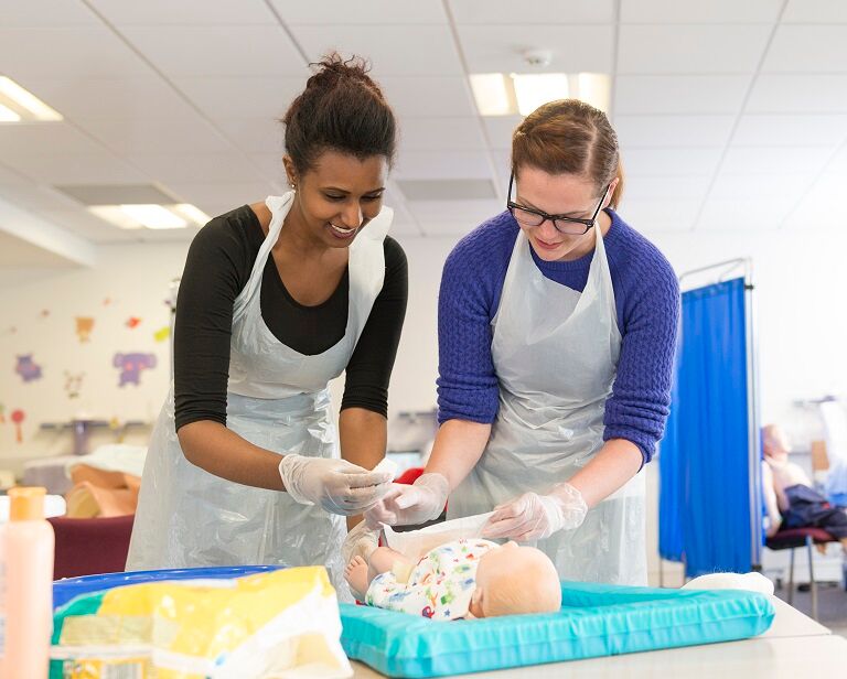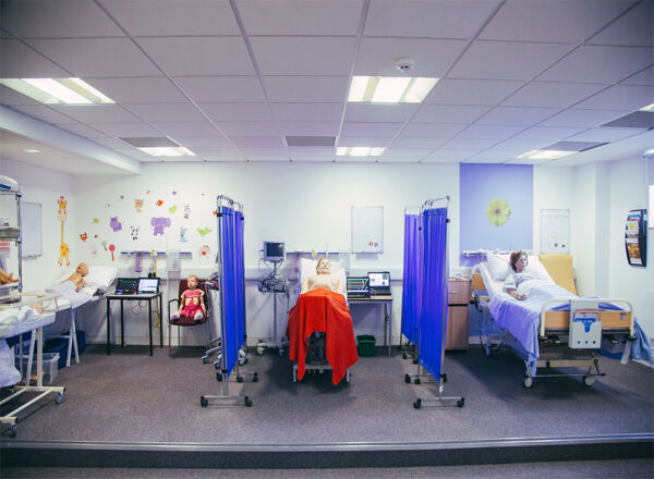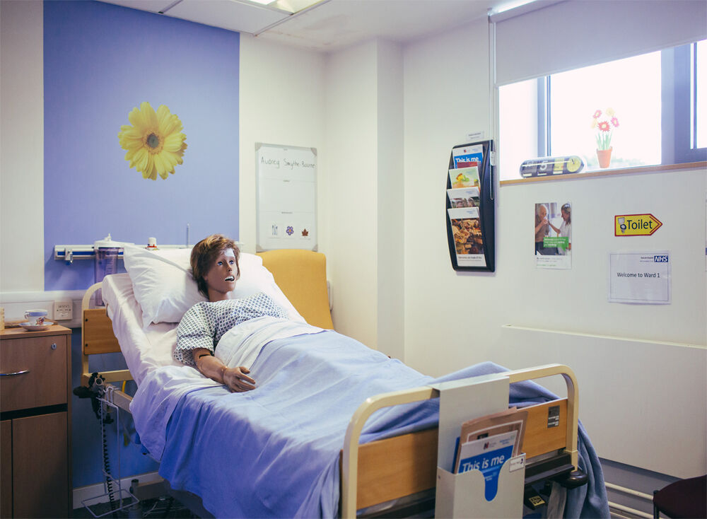 Within SPACE there are practical workstations and labelled trays containing various consumables and equipment. There are a variety of manikins and a ward area, complete with a hospital bed and cot. Additionally, there is a Dementia friendly ward and resource area, and a home environment/consultation space.